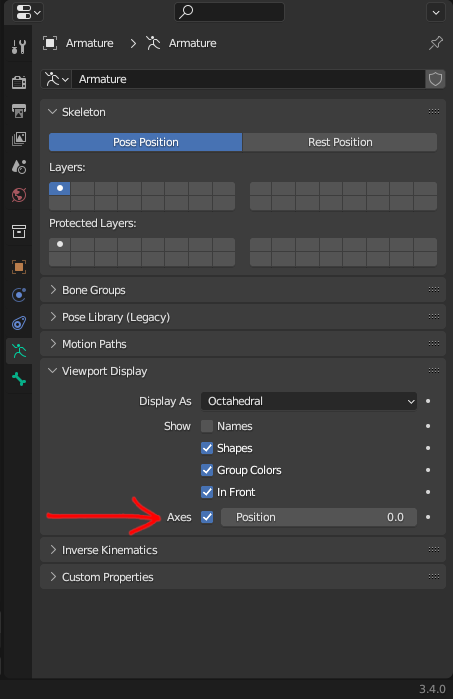 Before moving on, you should check your bone orientation. You can do that by going to Object Data Properties and under Viewport Display, toggle Axes. This will make the bones’s axes visible, so you can check if they are going to rotate in the proper direction.