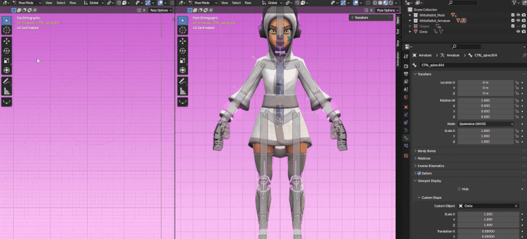 Now you’ll have to add constraints to bind the two skeletons together. To make this process easier, you can change the bone shape by clicking on Object Data Properties and, under Viewport Display, change Display As from Octahedral to B-Bone. Then, press CTRL+Alt+S to scale the bones up a little bit so their are bigger than the original ones.