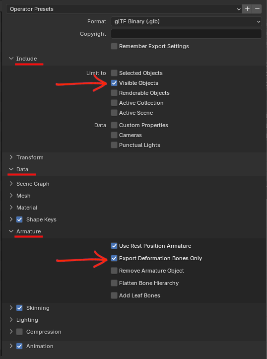 For the export settings, expand Include and in Limit to toggle Visible Objects. Then, expand the Data tab, expand Armature and enable Export Deformation Bones Only.