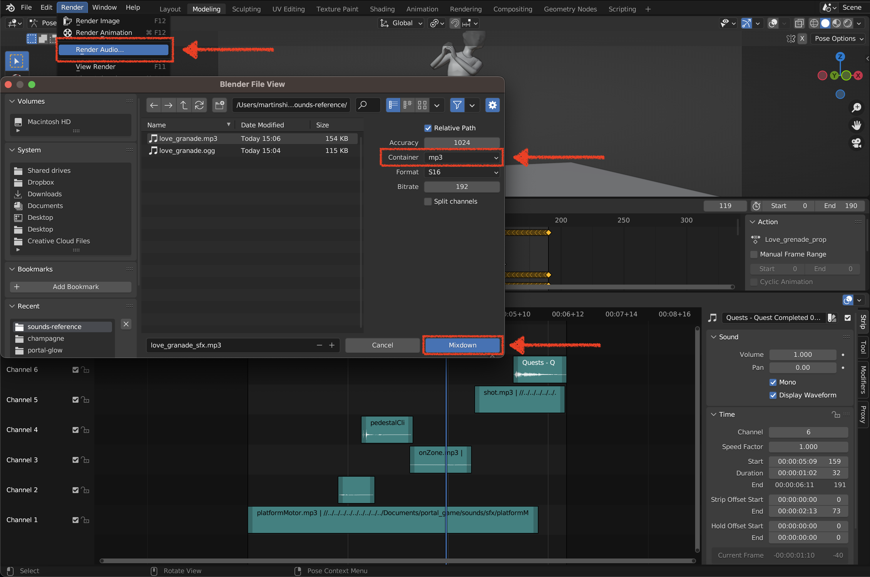 One way to add sounds to your emotes is using the video sequencer editor that Blender provides.