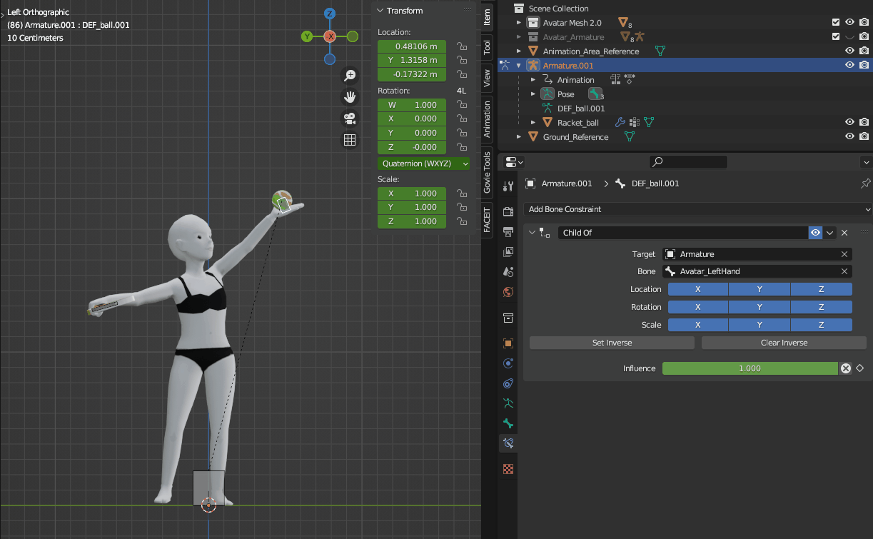 Then, in Target, select the avatar armature and in Bone select the bone you want the prop to follow. To maintain the prop’s original position, click on Set Inverse once you add the constraint. If the influence is 1, the prop will fully follow the selected bone, if it’s 0, the constraint will be disabled. You can set keyframes on the influence to turn it on and off throughout the animation. To do that, just press I while the cursor is on top of Influence.