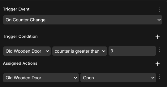 To make an action occur only once when passing a threshold, and not repeat on every increment after that, combine the counter with a State component. Set the State to “Done” whenever you reach the desired value, and add a condition to check this state on the trigger event.