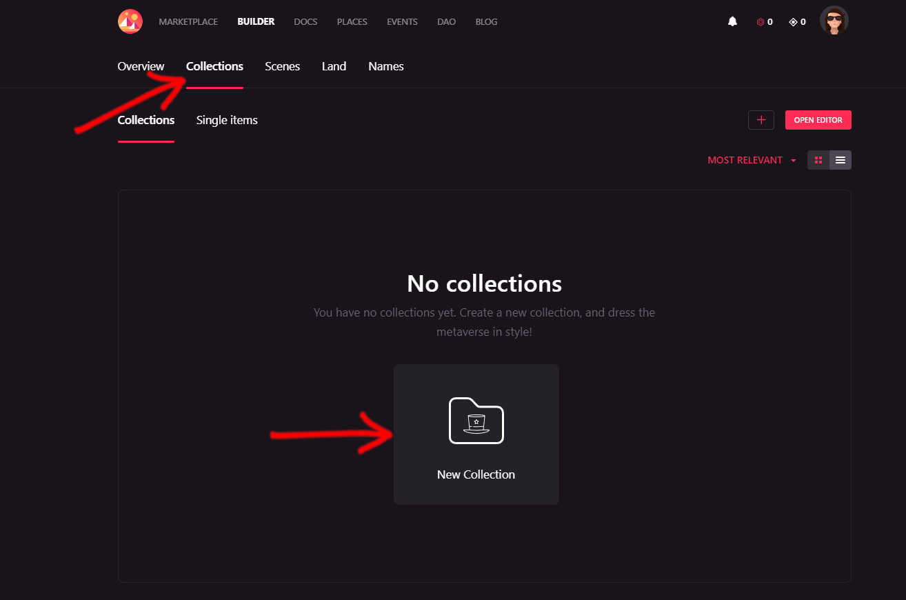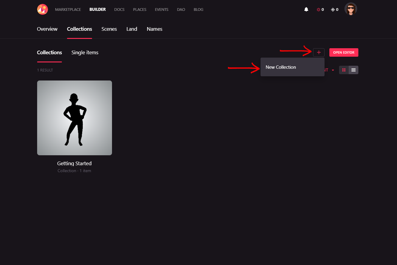 Before you can upload a wearable or an emote, you must create a collection first. To do that, go to https://builder.decentraland.org/ and click on Collections. If you don’t have any collections yet, click on the New Collection button, the one with an image of a folder. If you already have another collection, clikc on the + button and select New Collection.